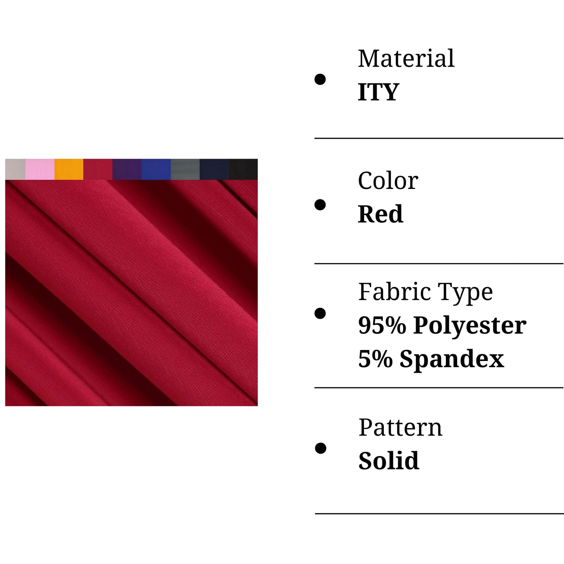 Premium red ITY (Interlock Twist Yarn) polyester spandex knit fabric with silky smooth hand, reliable stretch, and confident recovery. Opaque, drapey, and comfortable — perfect for dresses, tops, pants, and everyday garments that move with you.