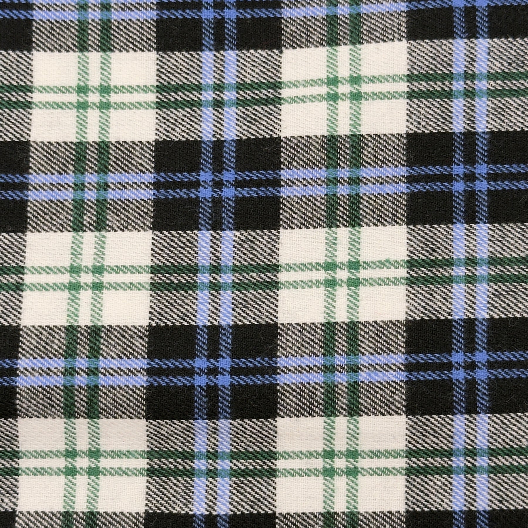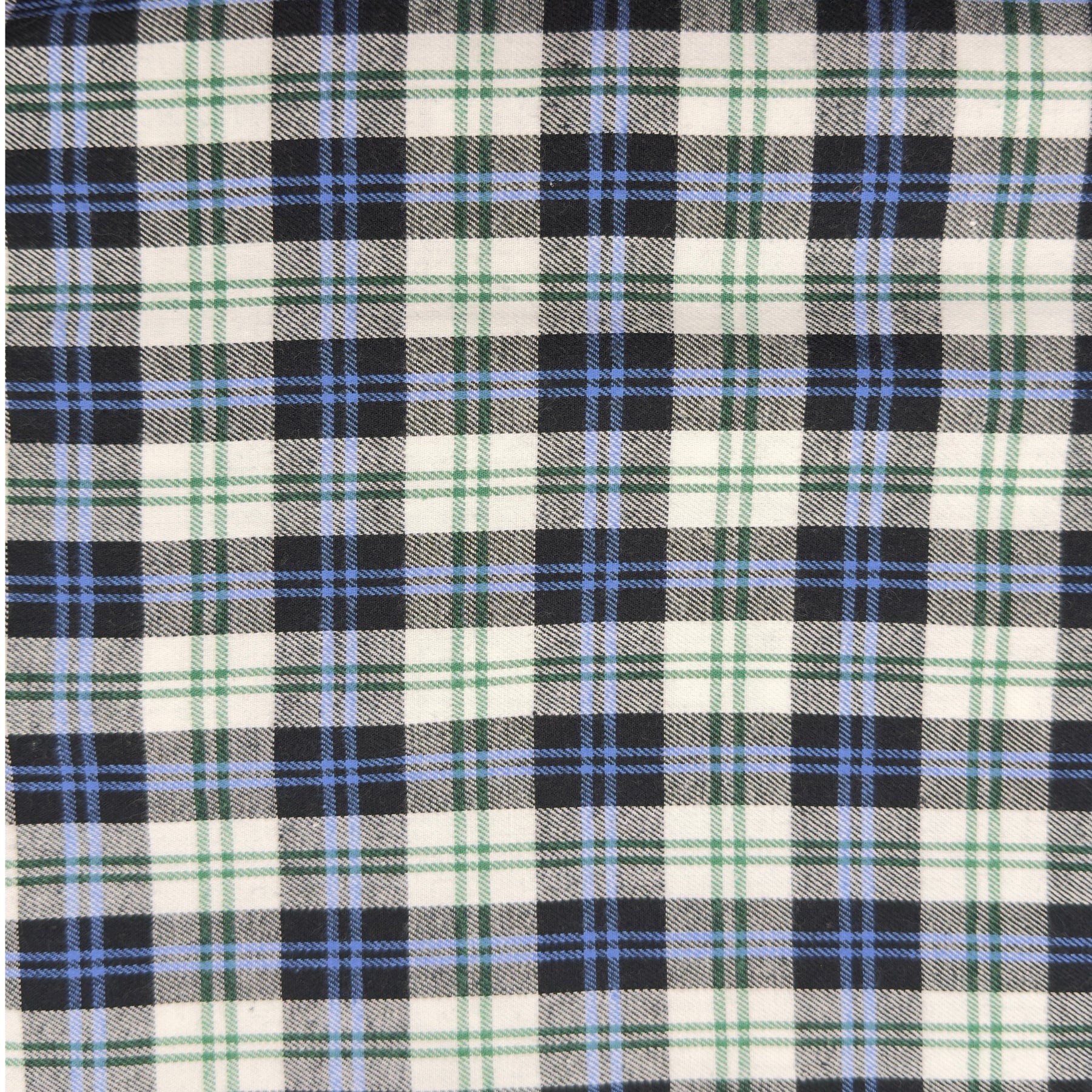 Close-up of a plaid fabric with black, blue, and green pattern.